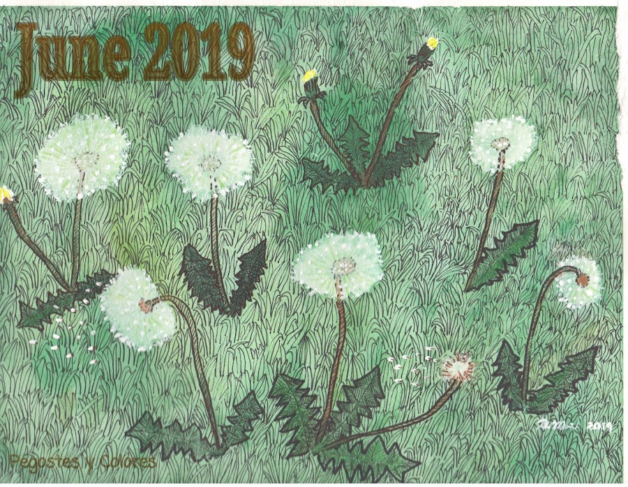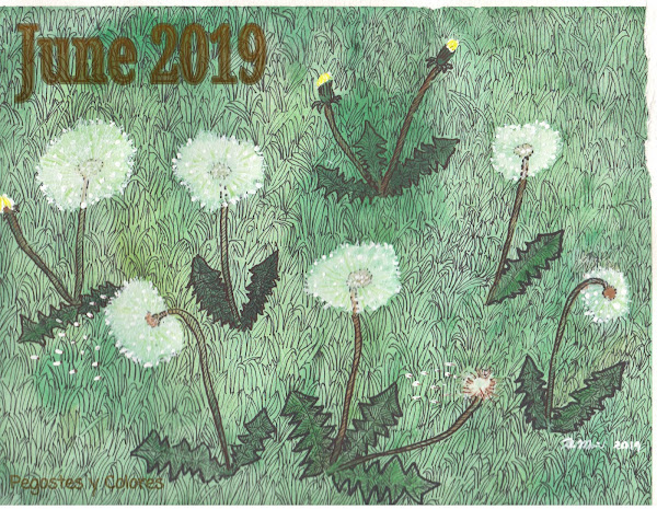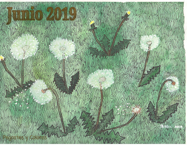 ¿Pensaron que me había olvidado de la portada de Junio? No y lamento que he venido con retraso, al fin la pude terminar. El reto de este mes me costo hacerla tres veces. Nunca había pintado Dientes de León. Pero los he visto de moda en muchos tableros, pinturas, mensajes... no pude resistirme.