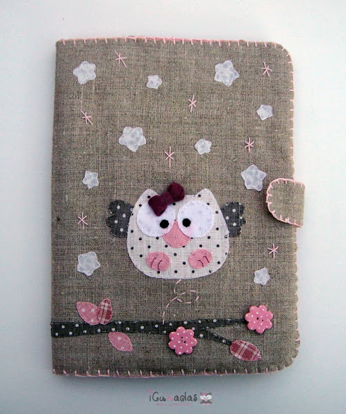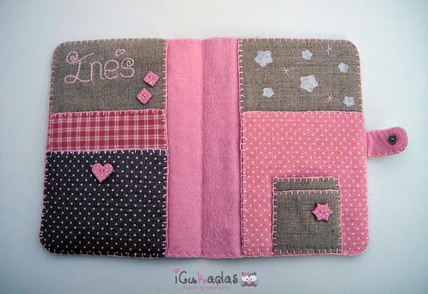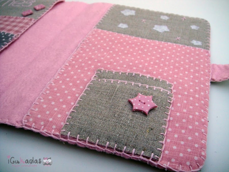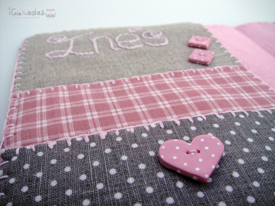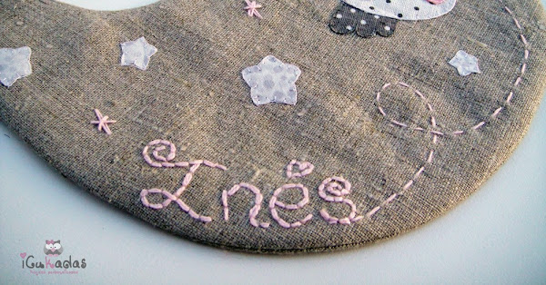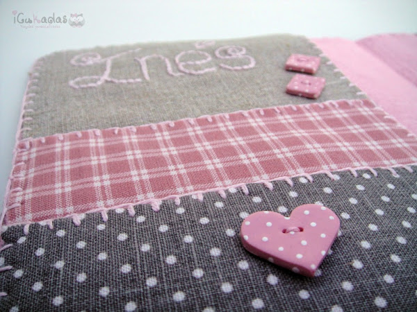 Por eso cuando nació mi sobri, me puse manos a la obra, y una de las cosas que le hice, fue este pack de portadocumentos, babero y chupetero, personalizado of course, con búhos como no, y con algo rosa, claro está.
