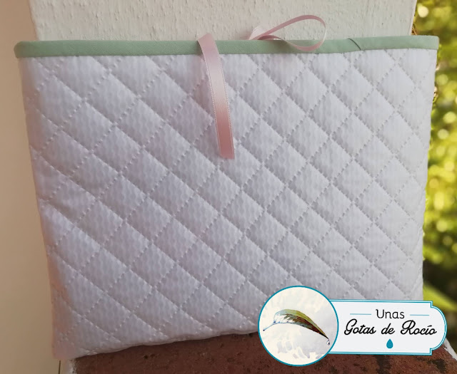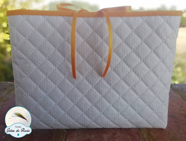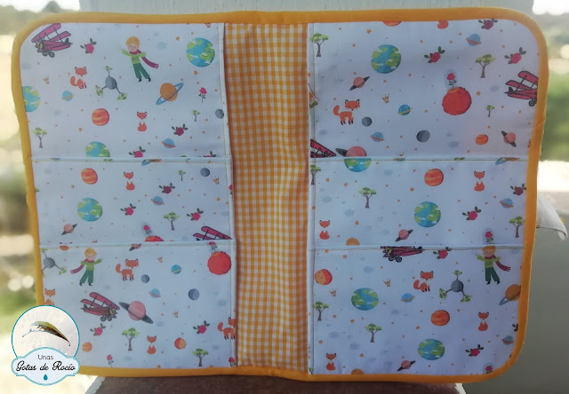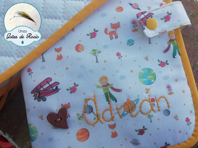 Este primero es para Adrián. Compré la tela de El Principito en la Algodonera Platero, y opté por combinarla con amarillo en el bies, el nombre, el snap, la cinta de raso y el interior. Ha quedado alegre y a la vez muy dulce con esa versión tan bonita del personaje de Saint-Exupéry.