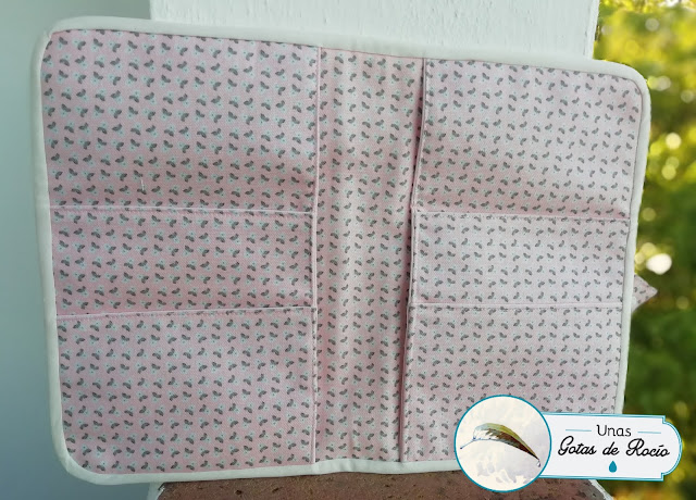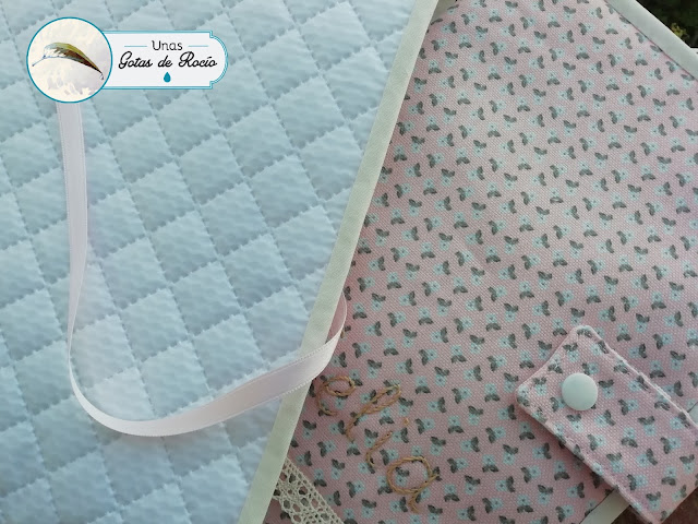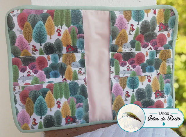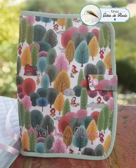 El segundo es para dos gemelas: Violeta y Olivia. La tela también es de Algodonera Platero, se la vi un día a Cidiana, que había hecho una mascarilla con ella. Me pareció uno de los estampados más bonitos que se ven con Caperucita como protagonista, así que le pregunté dónde la había comprado. En esta ocasión he combinado los complementos en rosa y verde agua. Pensé mucho y probé varias combinaciones. Finalmente opté por suavizar la abundancia de colorido de la tela con estos tonos suaves y que cromáticamente quedaban bien.