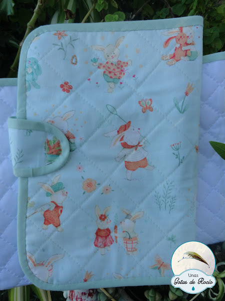 La tela es encantadora, con escenas de conejitos que se abrazan, juegan, leen, bailan o recolectan zanahorias.