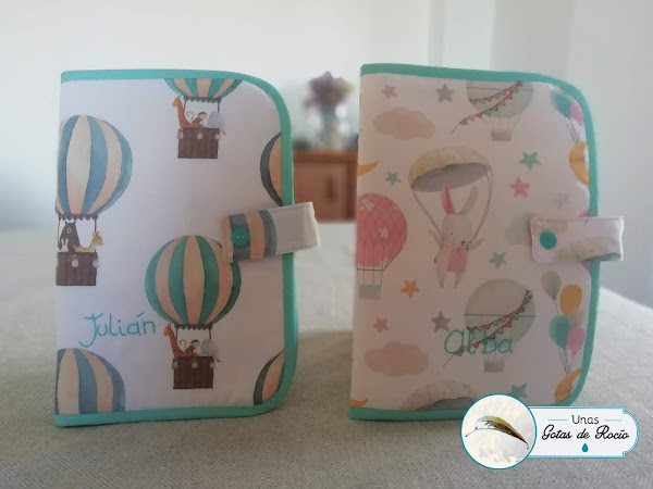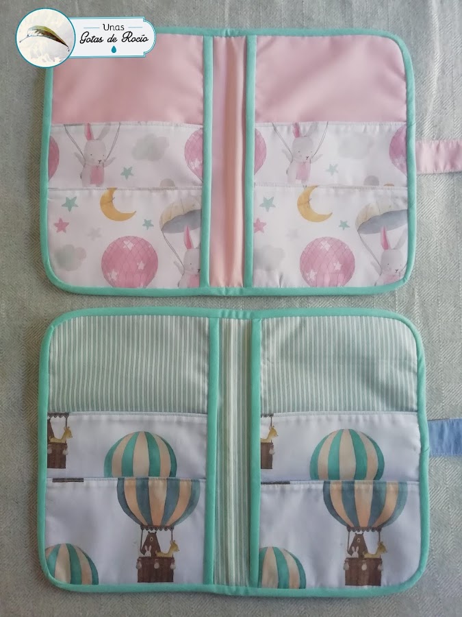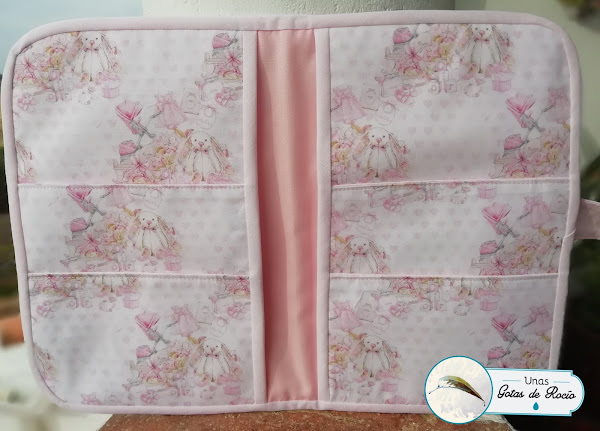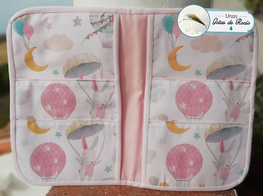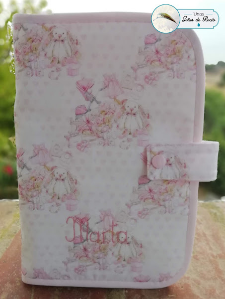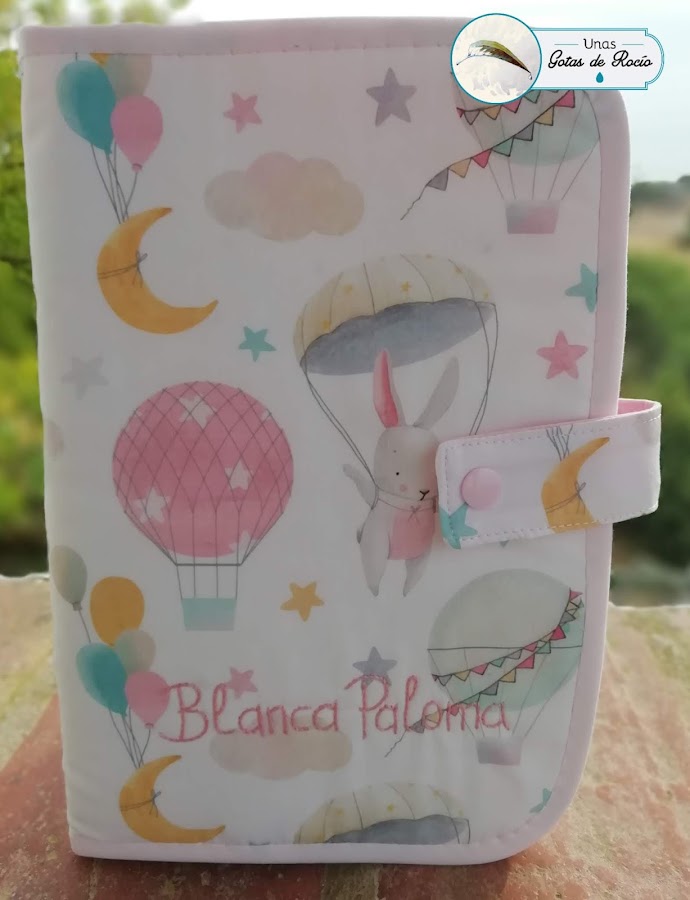 El portadocumentos de Marta ha quedado super tierno con esta tela de fondo blanco con corazoncitos rosas y objetos de bebé en los mismos tonos.