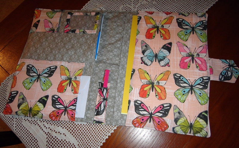 De la tela de mariposas: Un rectángulo de 37x23cm, otro de 18.5x23 cm y un cuadrado de 12x12cm que serán los bolsillos pequeños. Una tira de 13x6 cm que nos servirá para meter el bolígrafo y otra tira de 8x18 cm para hacer la solapa. Además, con el sobrante, una tira larga de 4x40 cm para el bolsillo de plástico.