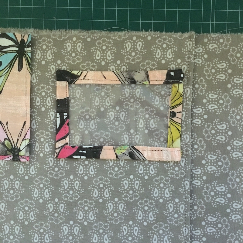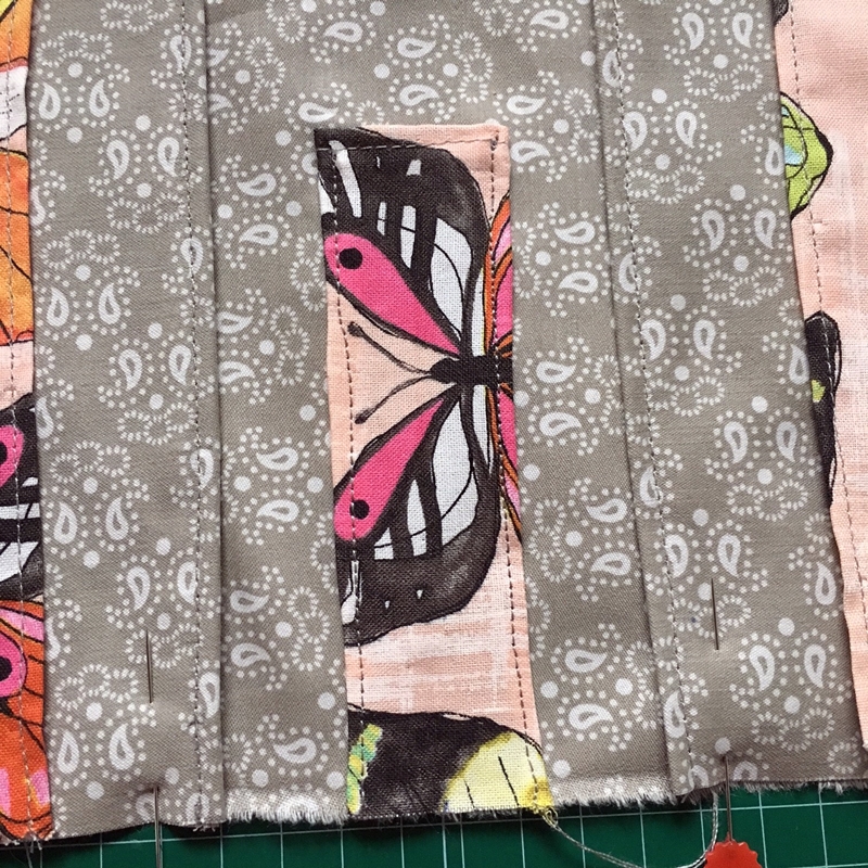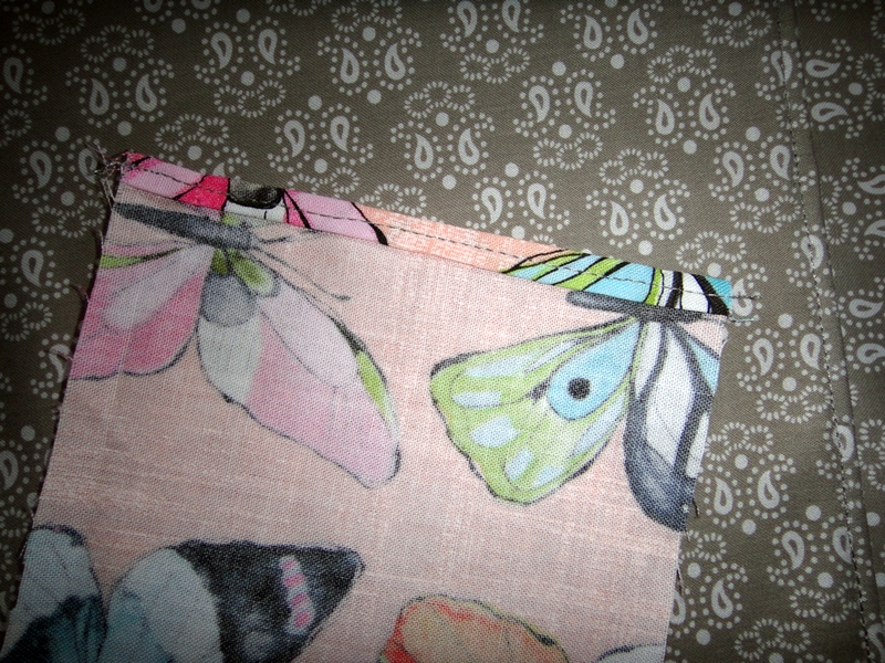 A continuación presentamos el bolsillo mediano de mariposas sobre el gris, y colocamos todo sobre la tela de base. Cosemos el bolsillo uniendo las tres capas de tela, y continuamos con la costura hasta el filo del bolsillo gris.
