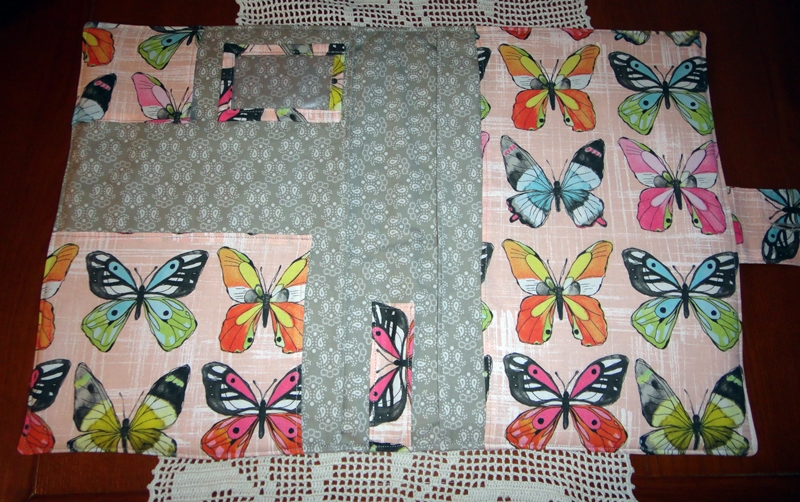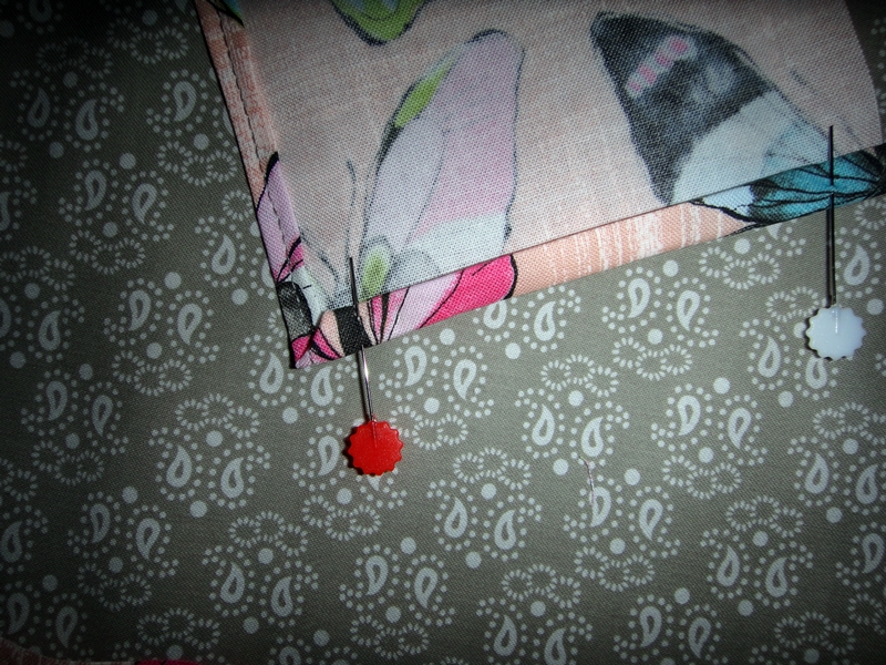 En el lado derecho presentamos el otro bolsillo gris, y sobre él colocamos el bolsillo grande de mariposas. Sujetamos todo bien con alfileres.