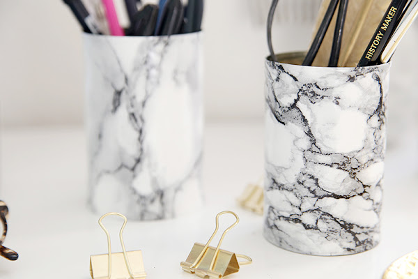 El efecto mármol es de esos acabados que quedan bien para decorar cualquier rincón de tu hogar. A mí personalmente me gusta mucho como queda en una mesa, en una maceta o bien en este lapicero. Así que aprovechando que tengo un rollo de este papel, creo que me voy a poner manos a la obra y voy a empezar a forrar todo aquello de mi casa que no me gusta.