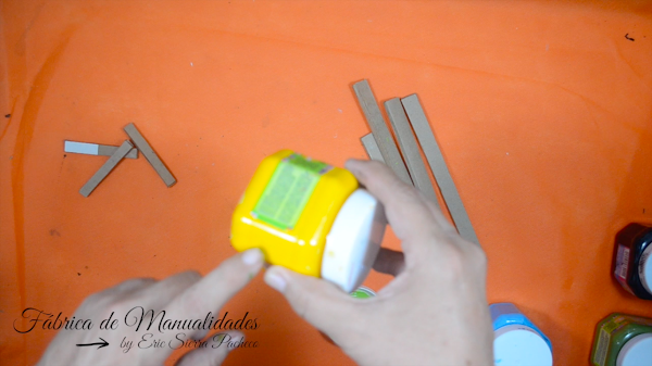 16. Vamos a pegar las piezas, empezamos con las tiras amarillas, usamos silicón caliente.