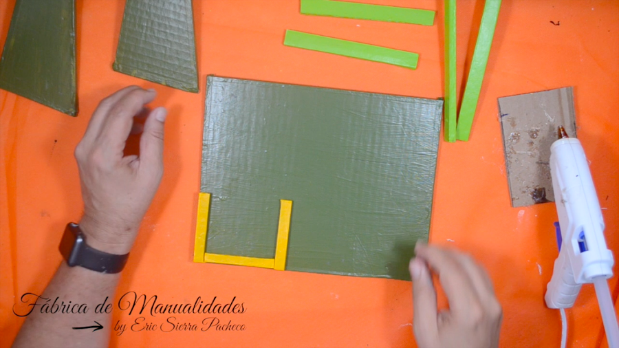 17. Ahora hacemos el marco de la pizarra, son las piezas en color verde limón, usamos silicón frío.