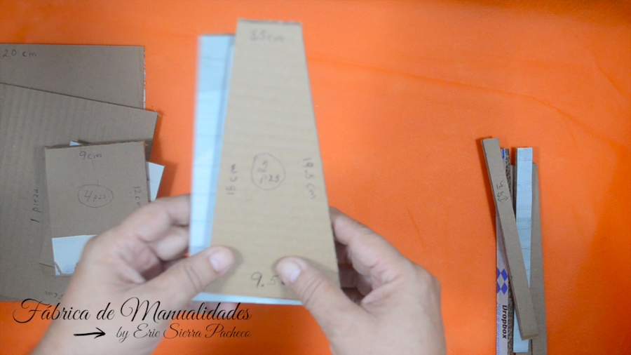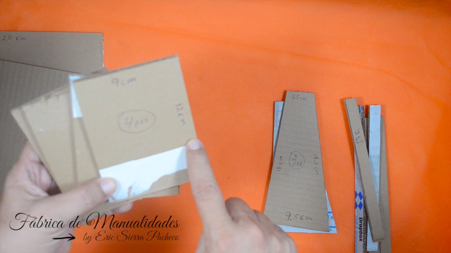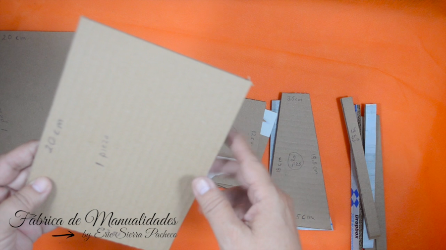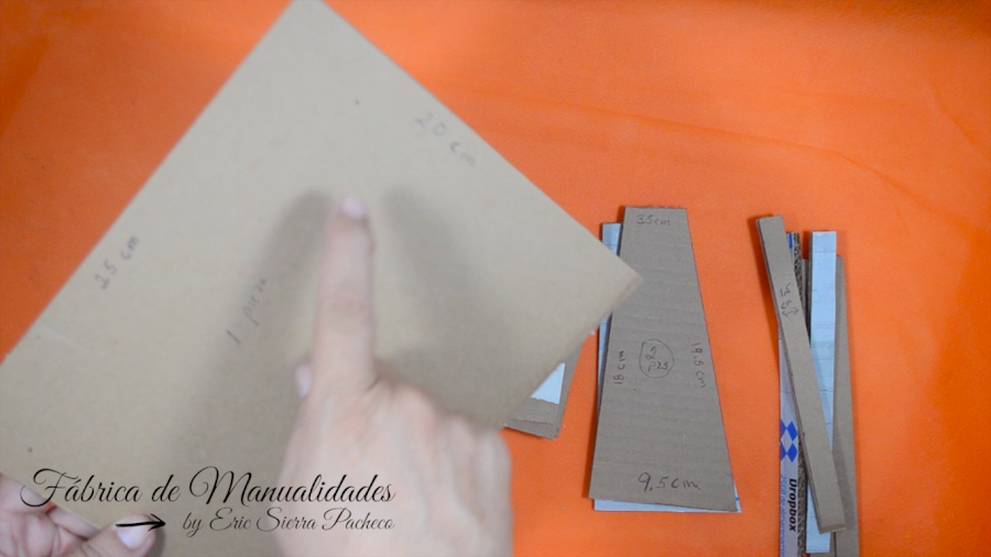 1. Cortamos varias piezas en cartón de doble canal, la primera es un rectángulo de 25 cm x 20 cm.