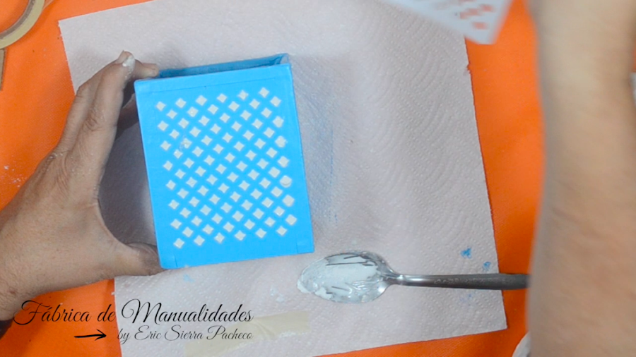 14. Aseguramos un stencil con cinta de papel (Masking tape) en la pieza azul, y con la ayuda de una espátula aplicamos el gesso para darle relieve con figura.