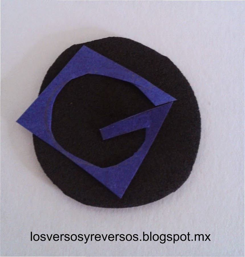 Con el papel azul, recorta un letra G y con el fomi negro haz un círculo y pégalos.