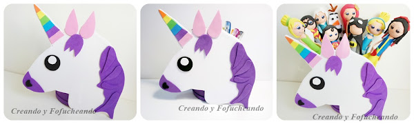 Y por último,el Cuerno. Lo formarán 6 mini piezas coloridas que iremos pegando en este orden de abajo hacia arriba: rosa,de nuevo el morado,un azul molón; encima un verde muy vivo,después el amarillo,y coronándolas todas la pequeñina en Goma eva naranja terminada en pico.