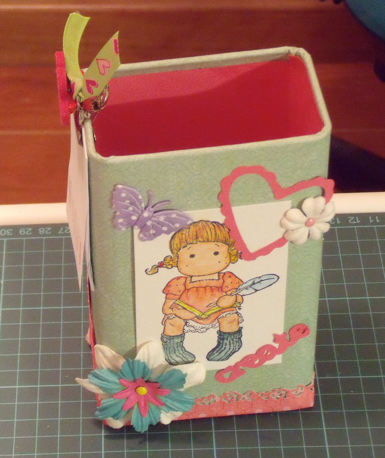 La magnolia está pintada con lápices acuarelables, con la Slice he cortado el create y el corazón. La parte de abajo del bote está hecha con una troqueladora de borde. Los papeles que he utilizado son de paper doll, me gusta mucho como ha quedado la combinación de colores! En uno de los laterales le he puesto brillantitos y ondulina.
