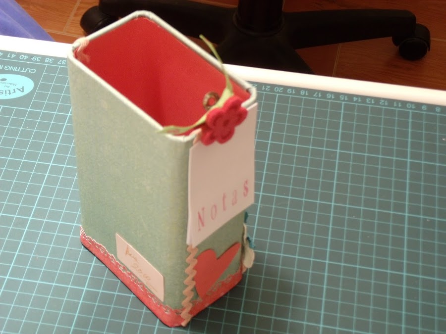 En el otro lateral también le he puesto ondulina, un corazón y un taco de posit, en el que he puesto con sellos "Notas", para decorar el borde de los posit le he puesto una pinza de papelería (metal) a la que he puesto una pinza de madera decorada con una flor de fieltro y a la pinza de metal le he atado una cinta estampada con corazones en rosa.