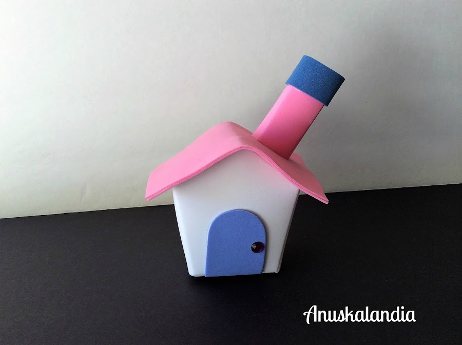 Hasta aquí podría llegar el tutorial y tendríamos una casita sencillita y muy cuca, que podríamos poner decorando en cualquier rincón infantil. También haciéndole dos agujeros en el tejado con un sacabocados, le pasaríamos una cinta y podríamos colgarlo. Pero, vamos a ir un paso más allá. Aprendamos a hacer una base sencilla, que es la que se utiliza, tanto en trabajos de este tipo, como para fofuchas. Ya os digo que es la base más conocida y la más fácil de realizar, y este ejemplo es el básico. Después que sepamos hacer esta, podremos hacer cualquier cosa, la imaginación es el límite.