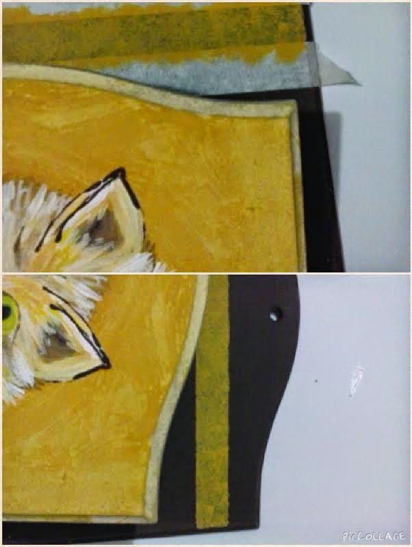 Como un simple detalle decorativo del porta recibos le pinté una franja color amarillo ocre también, coloque dos líneas de cinta adhesiva dejando una por el medio y con un pincel redondo pinté dando moteaditas para también lograr textura.