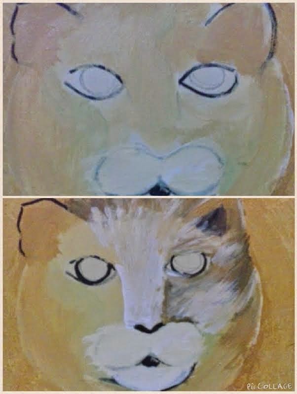 Y aquí ya vamos con el gato, bocetamos los ojos, orejas y hocico, con un pincel de cerdas finas hacemos el pelaje de nuestro gato, haciendo flecos de abajo hacia arriba, de derecha a izquierda y viceversa para dar el efecto de movilidad.