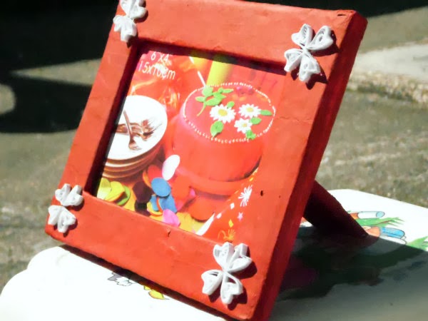 Es un portaretratos hecho con papel y cartón en color rojo con flores de pétalos blancos en forma de corazón, realmente es sencillo de realizar pero toma un poco de tiempo. Espero que les guste.