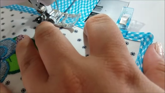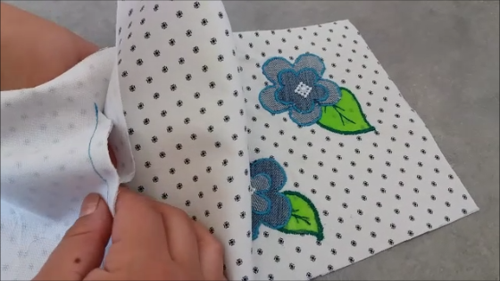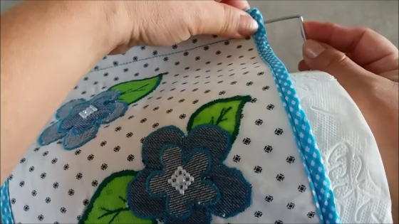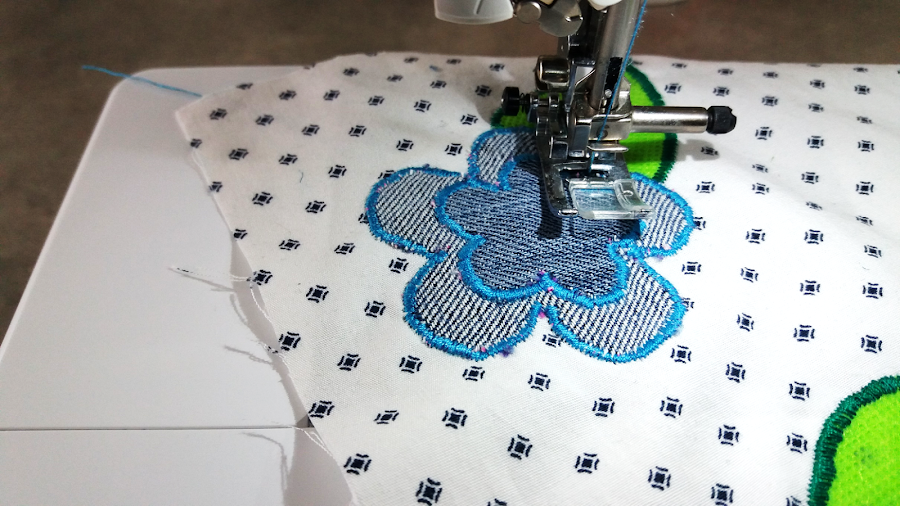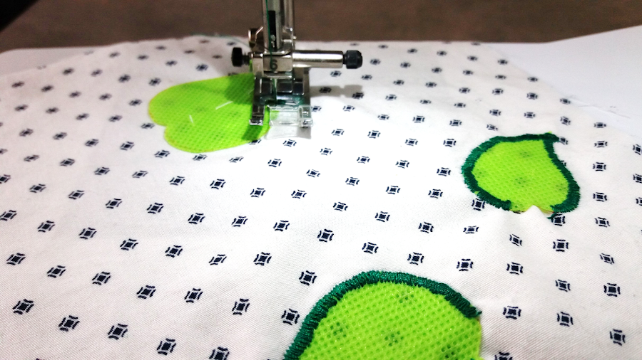 Colocamos entonces nuestro aplique en posición y cosemos por el borde a máquina y con una puntada en zig zag cortita y estrecha.