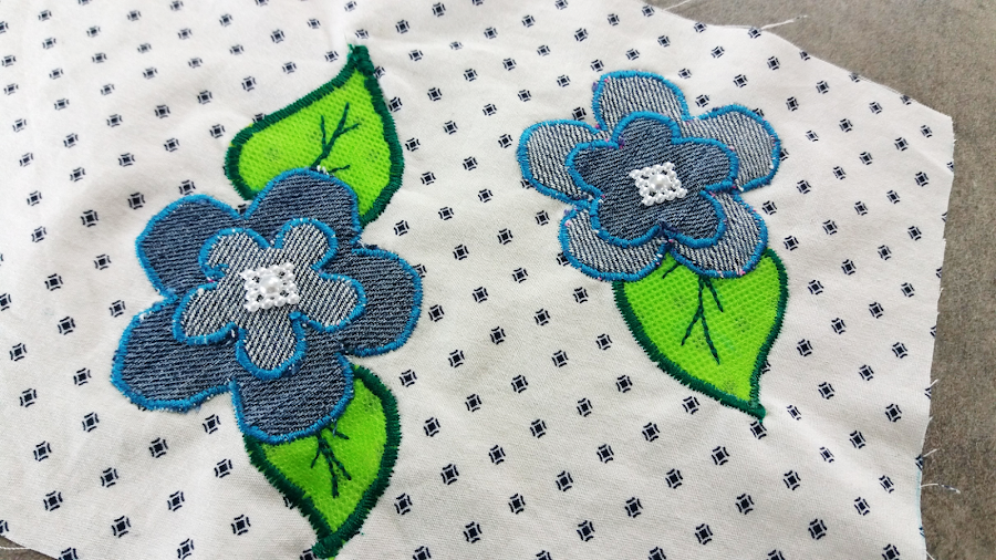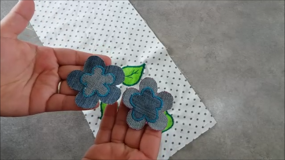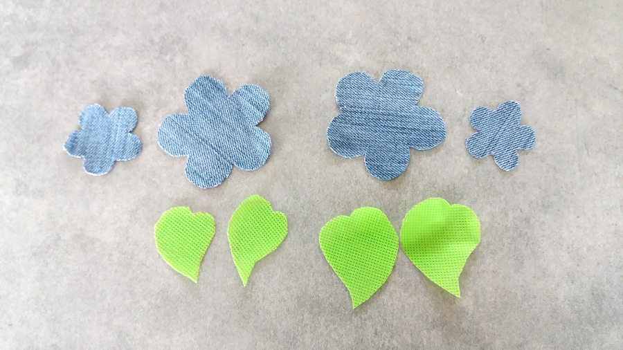 He sacado un diseño de flores en dos tamaños y las he hecho en tela vaquera de unos trocitos de retales.