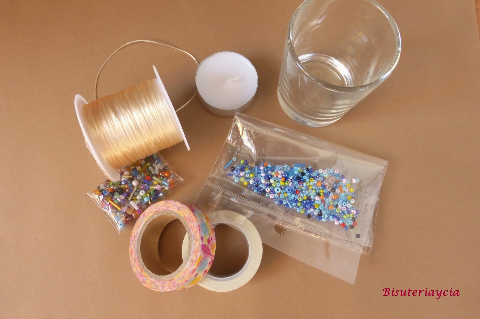 Para hacer estos portavelas vamos a utilizar unos vasitos de cristal, podéis utilizar botes de conserva o vasos de yogur, rocalla y canutillos de colores, goma elástica, velas pequeñas y washi tape.