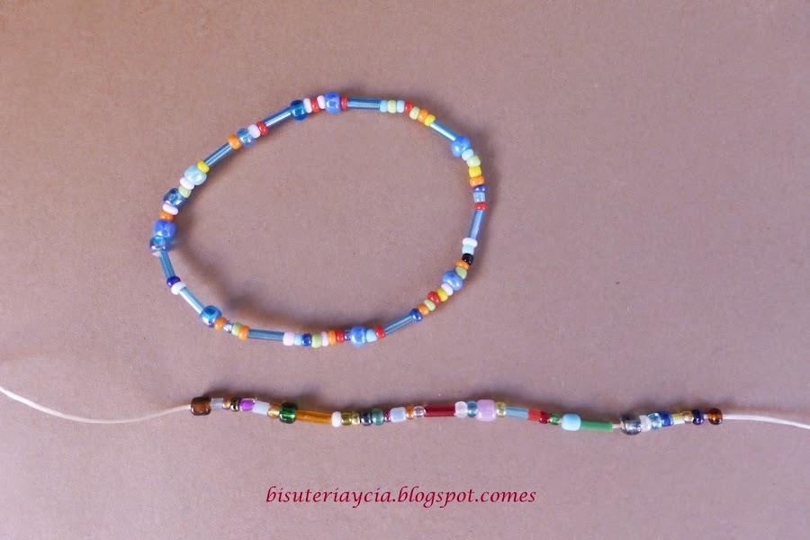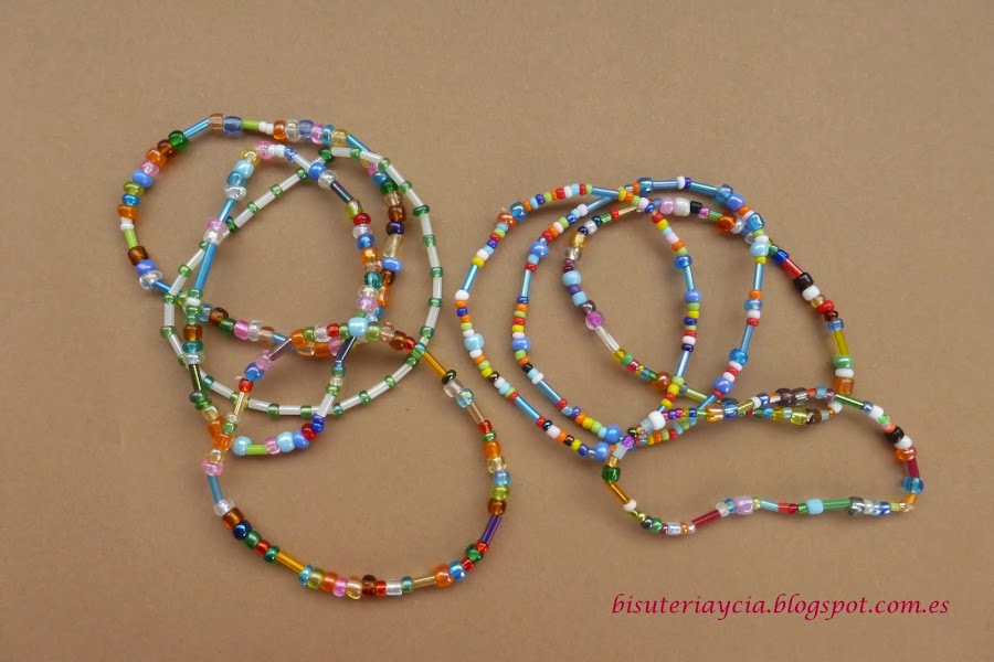 Empezaremos enfilando la rocalla y los canutillos en la goma elástica, haremos pequeñas pulseras, la medida sera el diámetro de nuestro vaso.