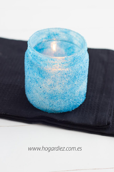 Una vez tenemos el bote bien limpio, hacemos el azúcar de colores, si no sabes cómo hacerlo, en nuestro post sobre cómo hacer azúcar de colores, te lo contamos. Ahora en un cartón extendemos cola blanca y con un pincel vamos pintando todo el tarro de cristal con la cola. A continuación, extendemos el azúcar del color elegido en otro cartón, y vamos pasando el tarro sobre el azúcar hasta que quede bien impregnado. Dejamos secar el tarro de cristal y una vez esté bien seco, sólo será cuestión de encender nuestra vela y disfrutar del agradable ambiente que se crea en nuestro hogar, una vez la encendemos.