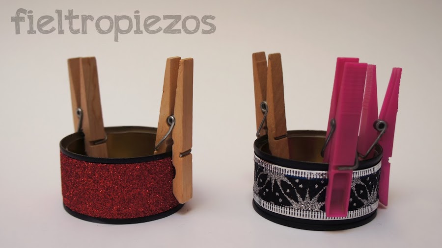 Para asegurarte de que el lazo se fija correctamente, puedes ponerle a las latas unas pinzas hasta que esté completamente seco.