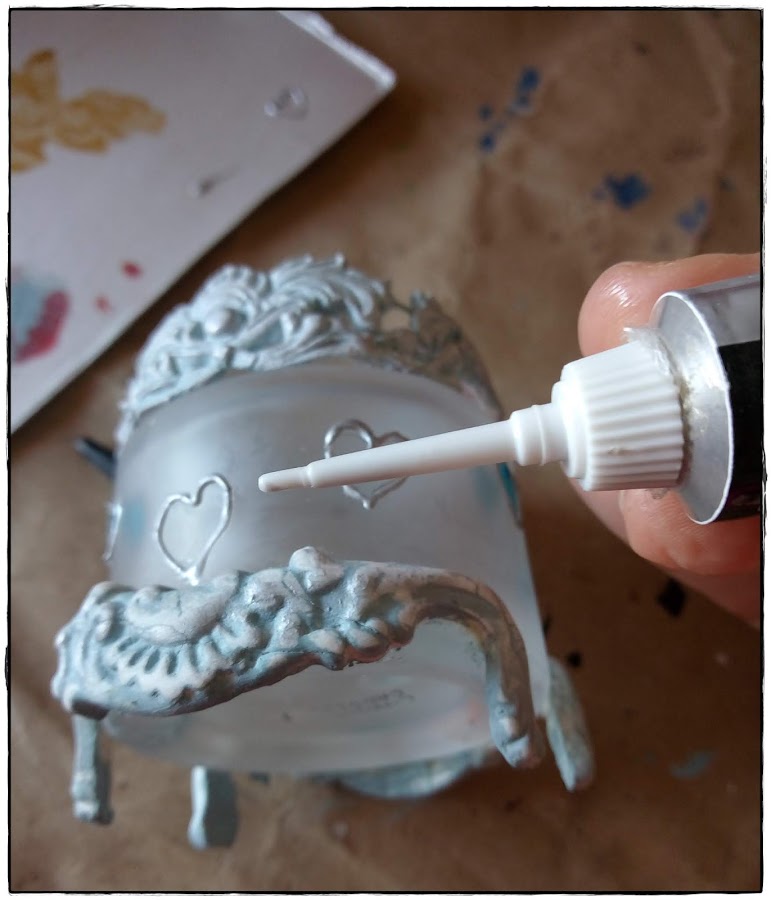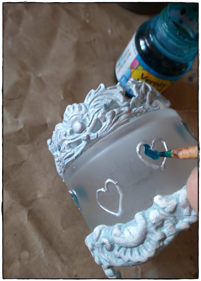 Para hacerlos más románticos, con pintura en relieve hice unos pequeños adornos en forma de corazones.