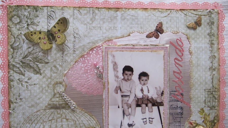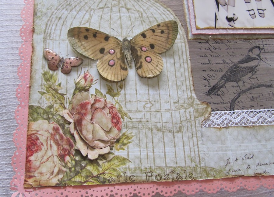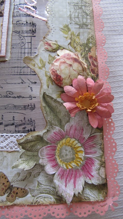 Cartulina rosa, papeles de Pinkpaislee, Bazzill Basics, acetato, troqueladora de bordes de Marta Stewart - - sello de Hero Arts con tinta Stazon - - encaje - - adornos como una cadenita y agujas decoradas - - blonda de pastelería que he embosado con polvos de Ranger - - tinta de Distress de Vintage photo para envejecer los bordes - - las mariposas, están en relieve menos la pequeña que esta al lado de las flores, a todas le he puesto Glossy accents y en algunas en sus puntos de las alas Liquid Pearls rosa, producto que también he utilizado con la palabra, que es imprimida y cortada a tijera - - las flores he jugado con el relieve y colores, utilizando distintas maneras de hacerlo, con cinta 3d, con silicona, o cortando pétalo por pétalo y pegando con cinta 3d, también he hecho una flor con troqueles de Artemio guiándome con un tutorial de A Beatiful Mess, que la he rociado con Glimmer Mist ( las próximas me saldrán mejor)