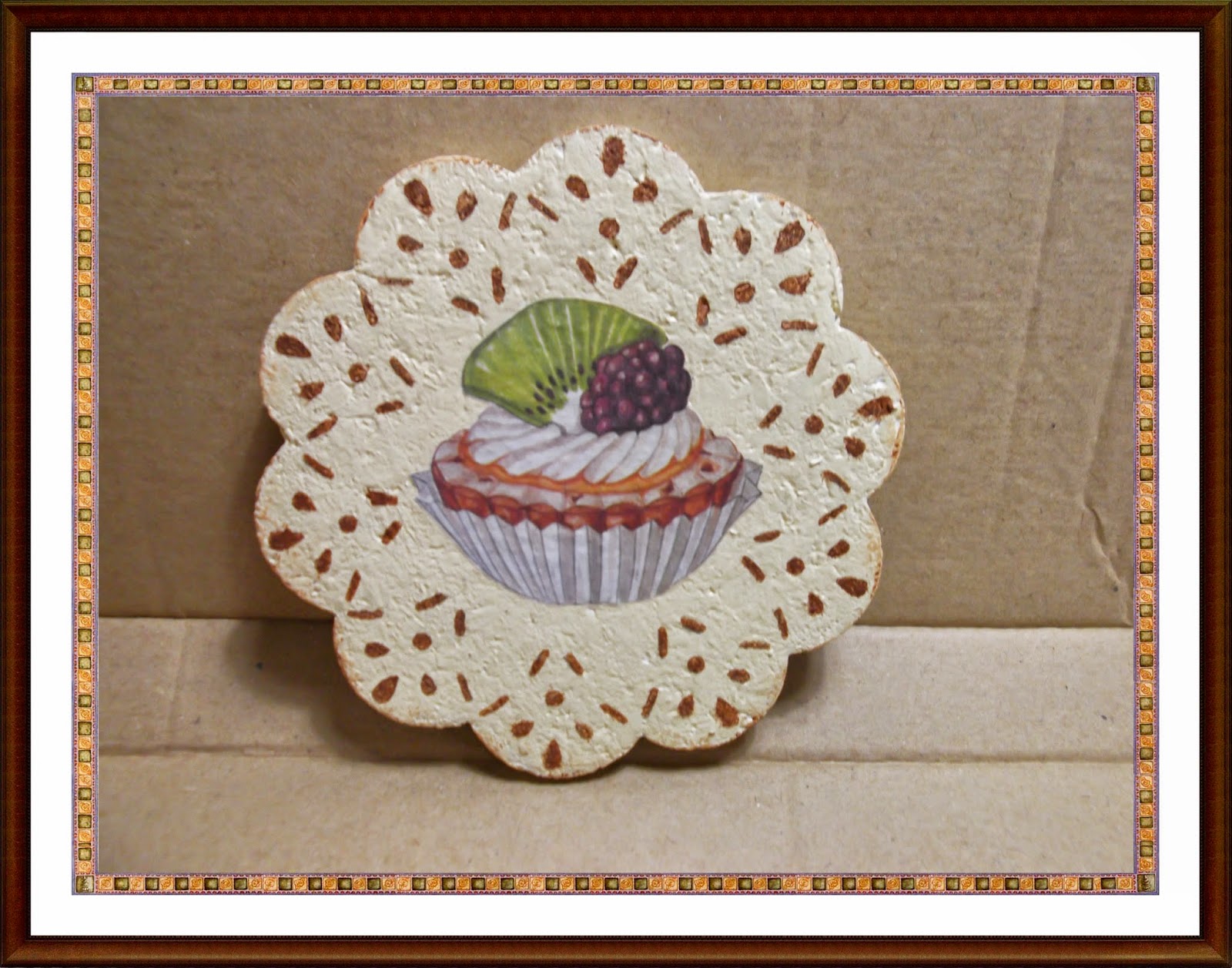 Una vez seco el decoupage, apliqué una capa de barniz satinado y en color chocolate, hice unos adornos con plantilla todo alrededor.