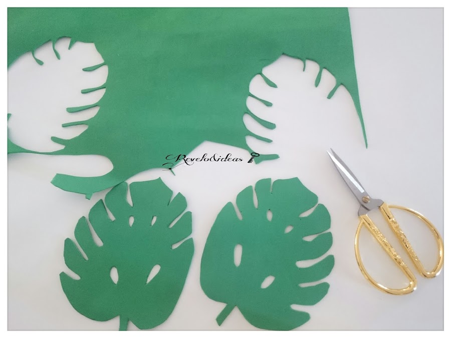 Recortar con las tijeras la hoja de monstera que hemos dibujado sobre la gomaeva, con mucho cuidado para que se hagan marcas sobre la gomaeva y no se nos estropee el trabajo.