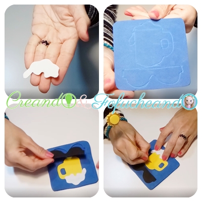 Y ahora repite conmigo: marcamos en la Goma eva, recortamos, colocamos sobre el posavasos, marcamos donde queramos que queden las figuras, recortamos los huecos y vamos colocando y cerrando el posavasos.