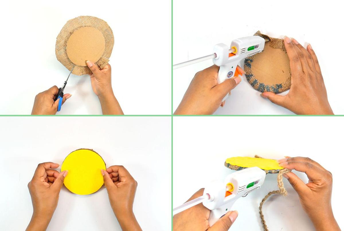 Pegar con silicona caliente la tela sobrante, cubriendo el canto de los círculos.