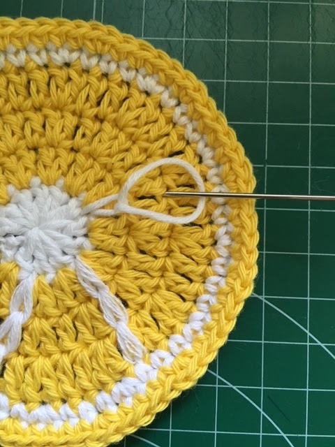 Para terminar los cítricos, hay que hacer con blanco las divisiones entre los gajos. Yo las he hecho con un punto de bordado que también se llama cadeneta, pero podéis hacerlas simplemente con un pespunte normal.