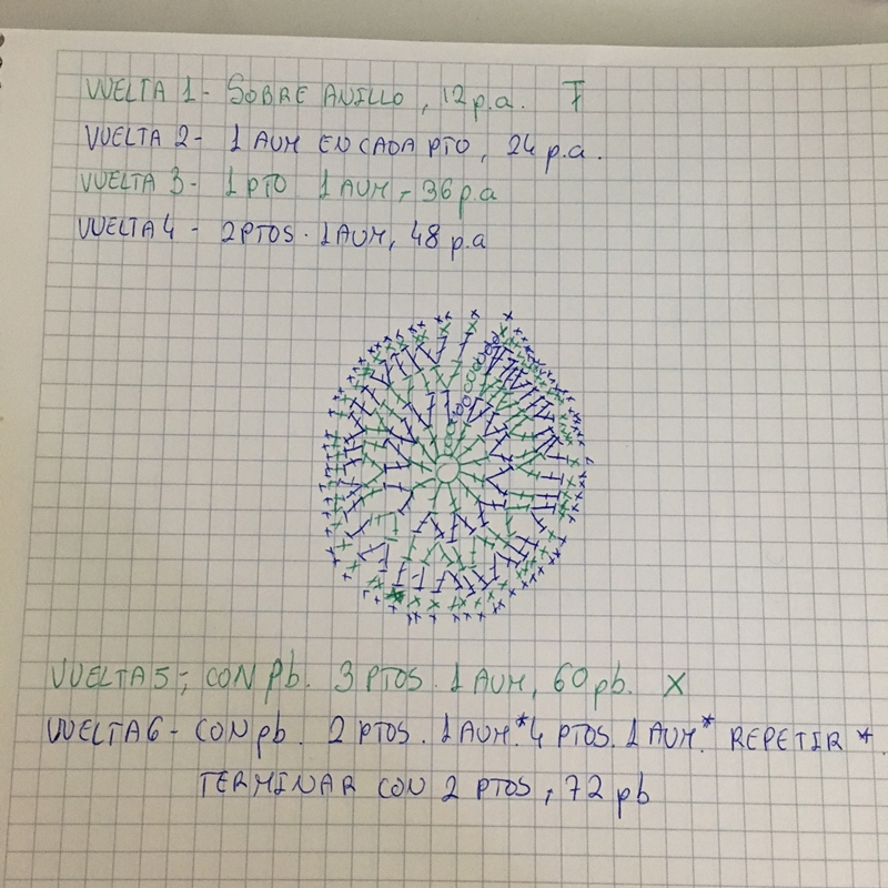 En realidad todos los posavasos de frutas se hacen siguiendo el mismo patrón base, con ligeras variaciones de uno a otro. El patrón utilizado es este (el dibujo me ha quedado un poco mal, pero tenéis escrito lo que va en cada vuelta). Es un circulo al que vamos haciendo aumentos proporcionales en cada vuelta para que nos quede plano.