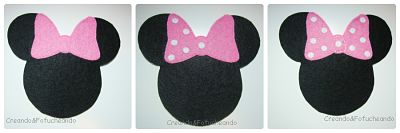 Y a Minnie le vamos a poner sólo su coqueto lazo. Ella va a llevar más piezas,en concreto 13: cabeza,lazo,y 11 mini piezas circulares de 0’5 en Fieltro blanco,que serán los lunares o topitos de su lazo.