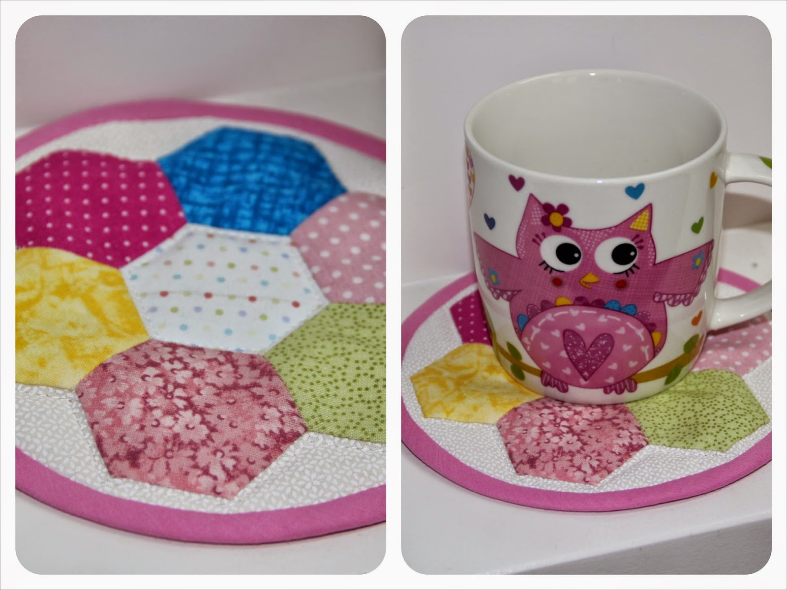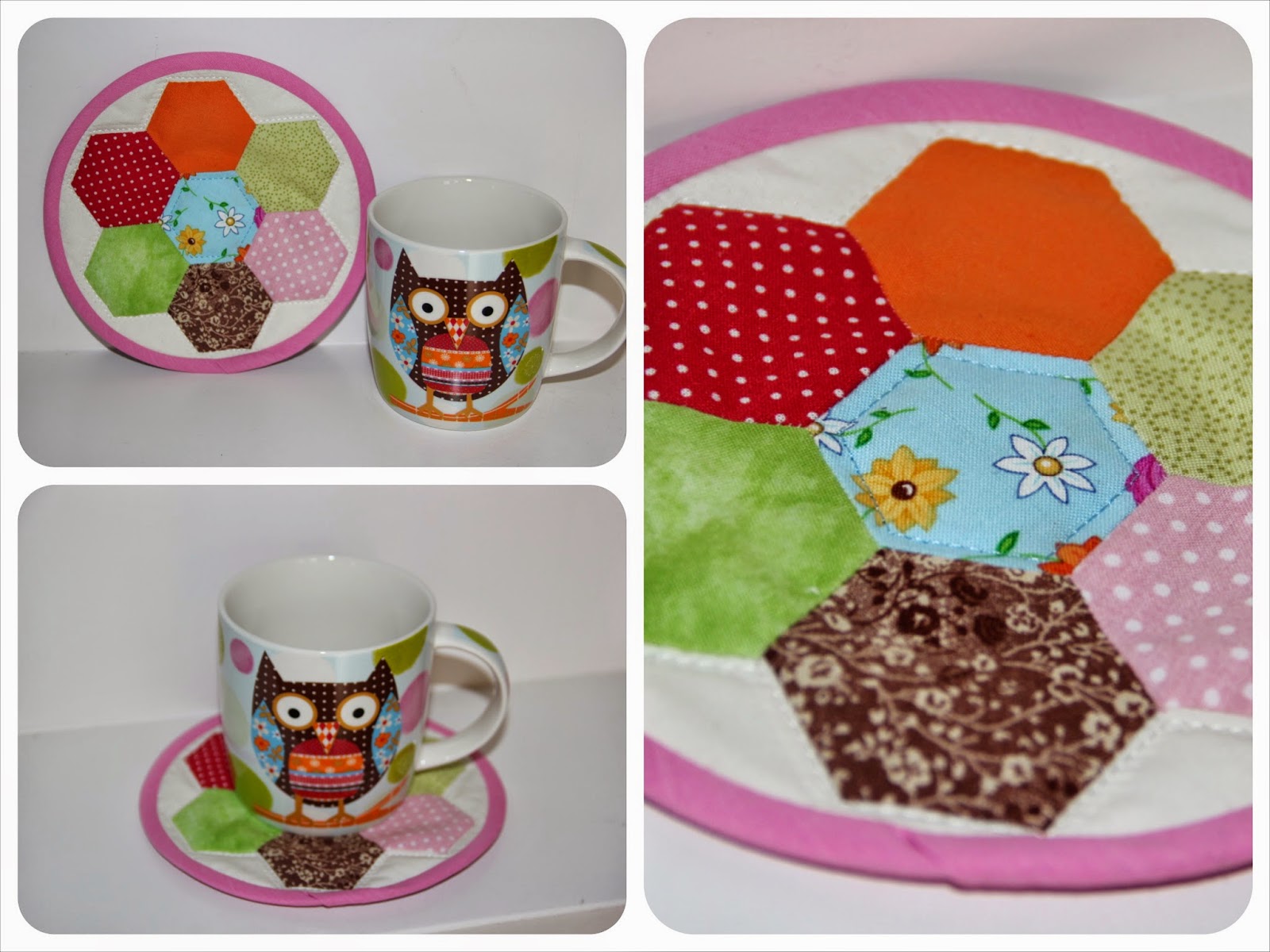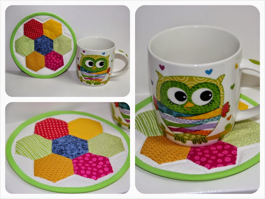 Y un día paseando por el pueblo donde vivo ahora, Sitges, me encontré en una tienda con unas tazas preciosas con dibujos de búhos. Y yo que soy una enamorada de las tazas, en ese momento me vino la idea a la cabeza: ¡Un posavasos a juego con estas tazas tan bonitas! y de esta manera también aprovechaba los retales que me van quedando de otros trabajos.