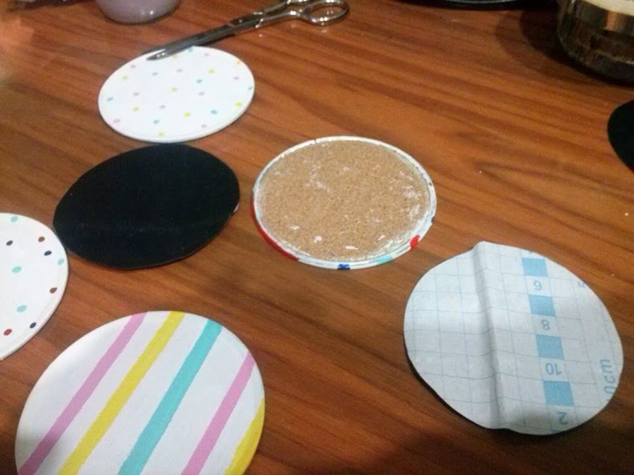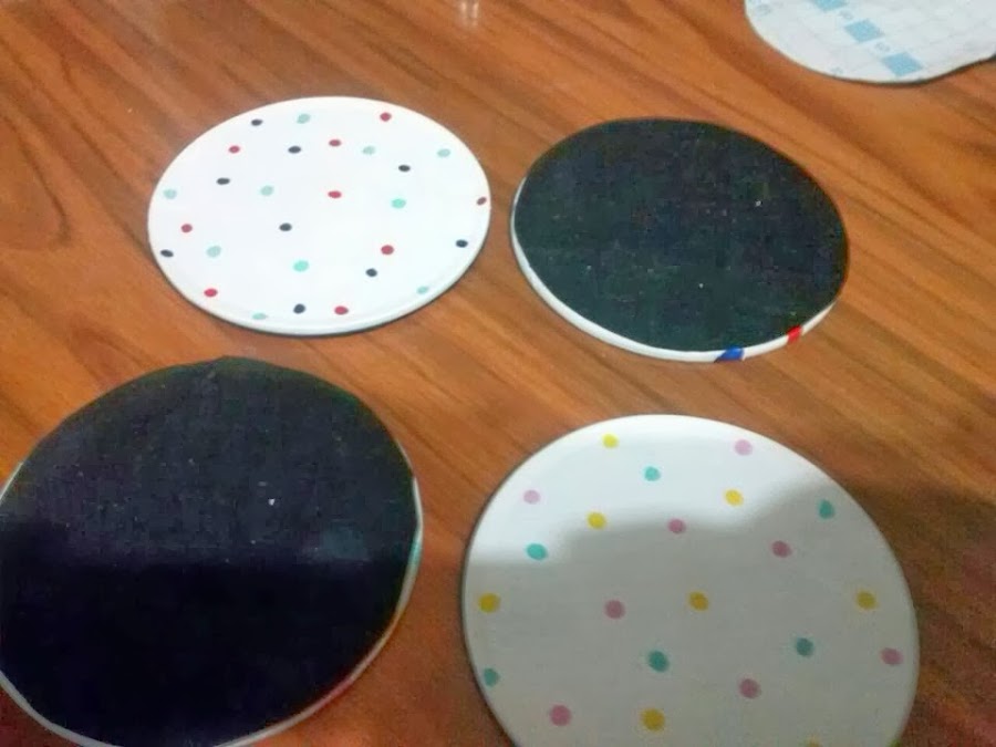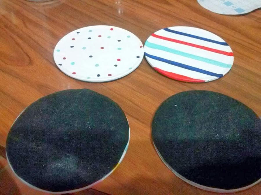 Cuando ya estaban los dos modelos secos, por la parte posterior le pegué un redonda de las mismas dimensiones que el posavasos de papel adhesivo de ante.
