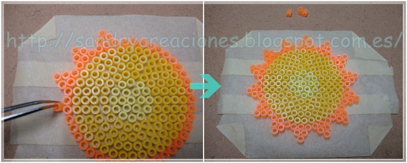 El siguiente paso será poner los detalles externos que queramos, en nuestros caso los rayos exteriores del Sol o las partes del anillo del planeta que faltaban. Iremos poniendo los Hama Beads Midi que necesitemos con cuidado en la zona donde queramos que vayan, pegándolos encima de la cinta de carrocero en contacto con la zona del circulo donde los queramos poner. Una imagen vale más que mil palabras, así que aquí os dejamos una imagen explicando visualmente este proceso: