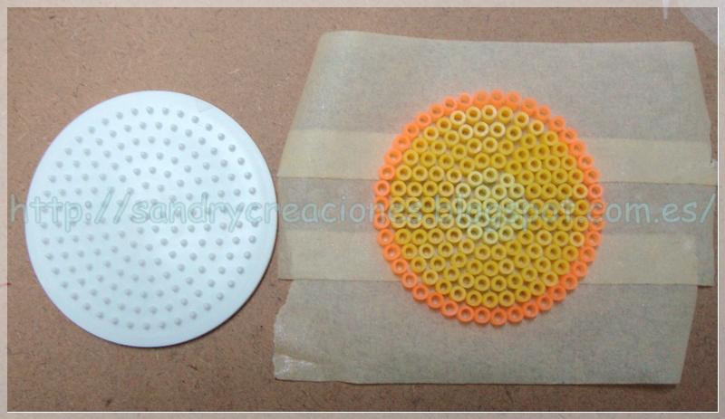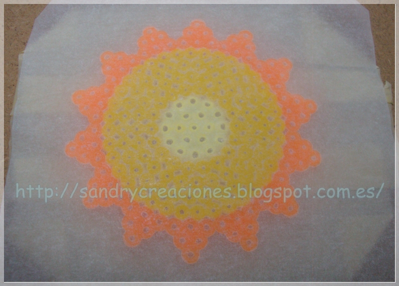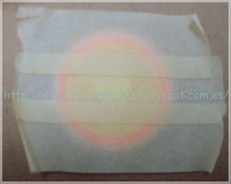 Dejaremos de planchar una vez veamos que todos los Hama Beads Midi transparenten a través del papel de horno y veamos que se han unido todos entre sí, como ejemplo podéis ver esta imagen una vez finalizamos el primer planchado del posavasos del Sol:
