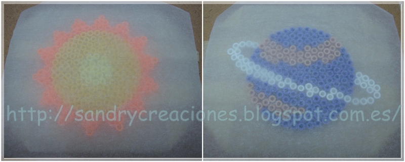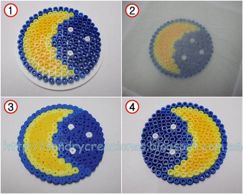Al tener terminadas la Tierra y la Luna pasamos a plancharlas y así dejamos estos dos posavasos terminados. Para planchar haremos lo mismo que ya explicamos en otras entradas de Hama Beads, pero esta vez subiremos un poco más la temperatura de la plancha ya que los Hama Beads Midi, al ser más grandes que los Hama Beads Mini, necesitan más temperatura para fundirse. Si para los Hama Beads Mini usábamos la temperatura para lana en este caso usaremos la temperatura de algodón. En este caso nosotros solo los planchamos por un lado, ya que así quedan más flexibles y la parte no planchada tiene mayor adherencia adaptándose mejor a cualquier superficie, algo que viene muy bien en este caso de los posavasos.