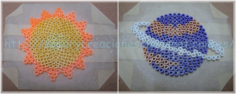 Una vez tenemos el diseño, lo pasamos a la placa utilizando el color de Hama Beads Midi que necesitemos en cada zona, de esta forma creamos la Luna, la Tierra, el cuerpo del Sol y el cuerpo del planeta con anillo. Como habréis visto, los diseños del Sol y del planeta con anillo tienen extensiones que no caben en la placa, así que de momento los dejaremos aparcados y nos centraremos en terminar la Luna y la Tierra que ya estarían listas para planchar y en unos párrafos os contamos el proceso para hacer estos detalles del Sol y el planeta con anillo .