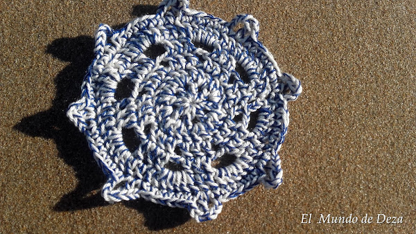 El segundo posavasos con dos hilos uno en crudo y otro hilo azul, los dos a la vez (doble hilo) siguiendo el esquema (al final de esa publicación)