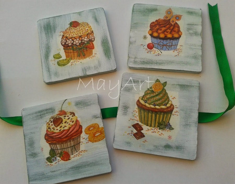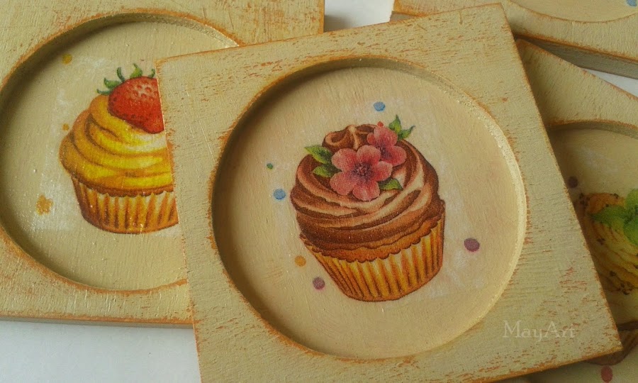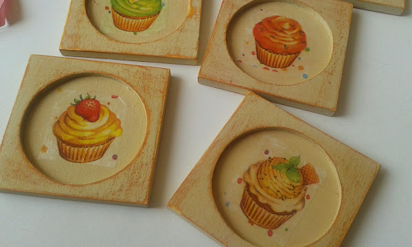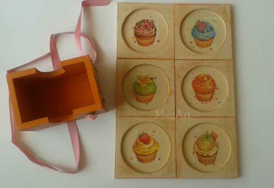 Di una mano de pintura de tiza tono naranja, le pasé un poquito la famosa vela y después una pasadita de tono encaje. Lijadita y colocación de los pequeños cupcakes en la circunferencia de cada culín de vaso.