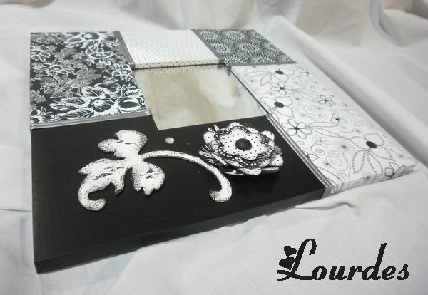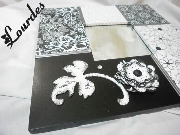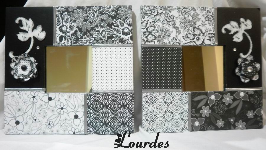 Otra composición de dos espejos esta vez jugando con los tonos grises y el blanco roto Flores realizadas en papel, silueta de madera, perlas y la composición de los estampados rematada con plomo adhesivo