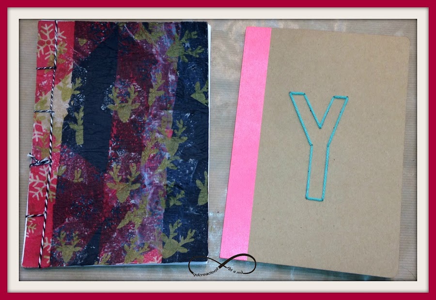 La de la izquierda es cosido japonés y la técnica decoupage y la otra es cosida con lana y siguiendo trazos rectos, más fácil.
