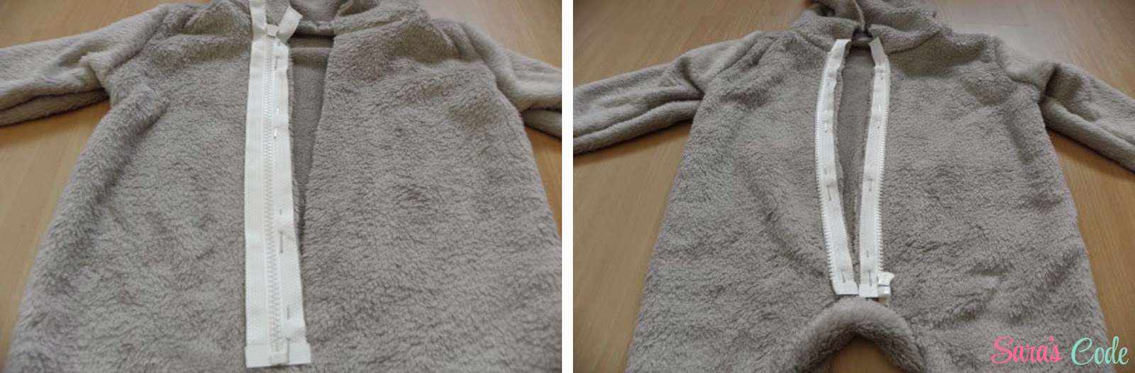 ? Colocamos derecho de la tela de jersey contra derecho de la tela Minky, embolsando el tejido exterior dentro por dentro de la tela de jersey, colocamos alfileres sujetando las dos piezas desde la parte inferior de la cremallera, pasando por la capucha hasta llegar al otro lado de la cremallera.
