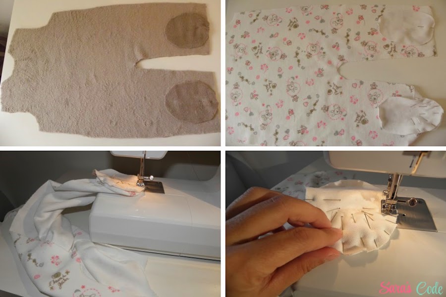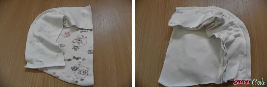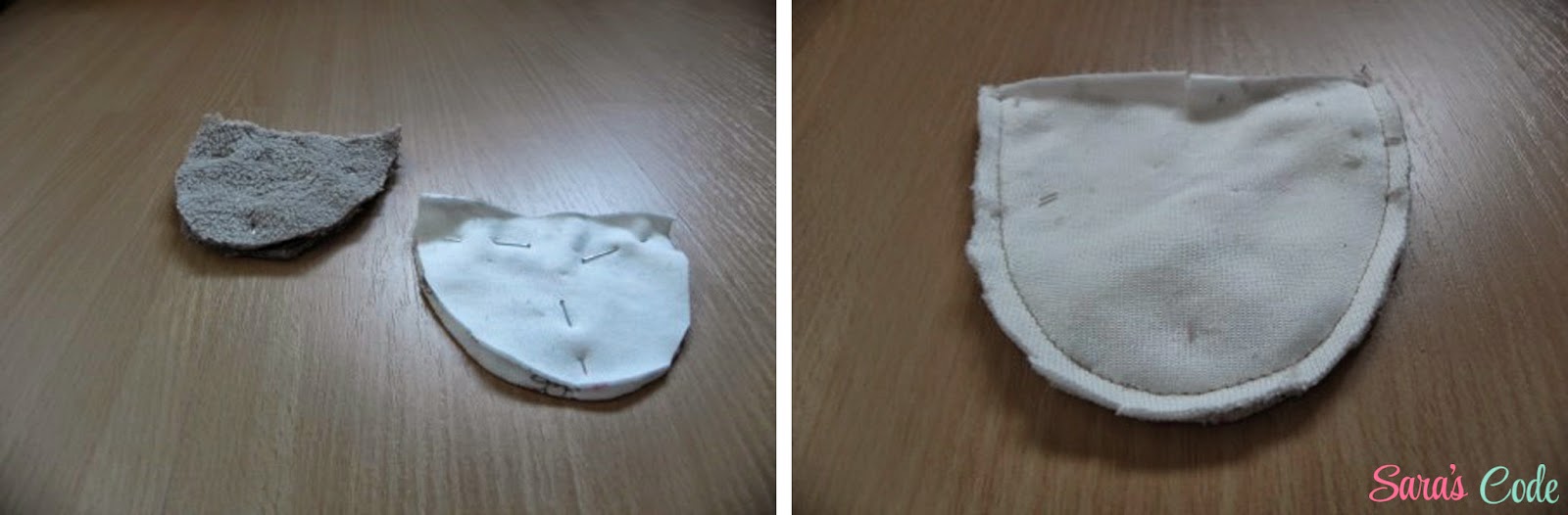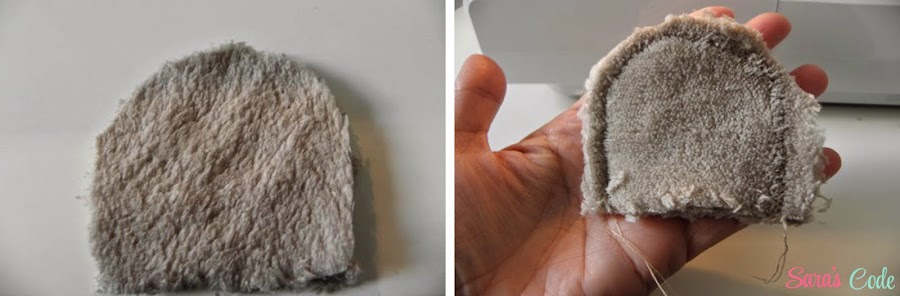 ? Cogemos las cuatro piezas de las orejas, enfrentados derecho contra derecho y cosemos, dejando la parte inferior sin coser, damos unos pequeños piquetes en la parte con más curva y damos la vuelta a la pieza por el derecho.