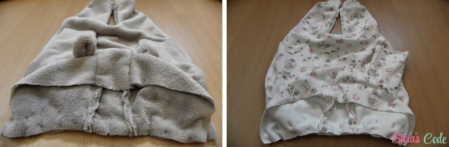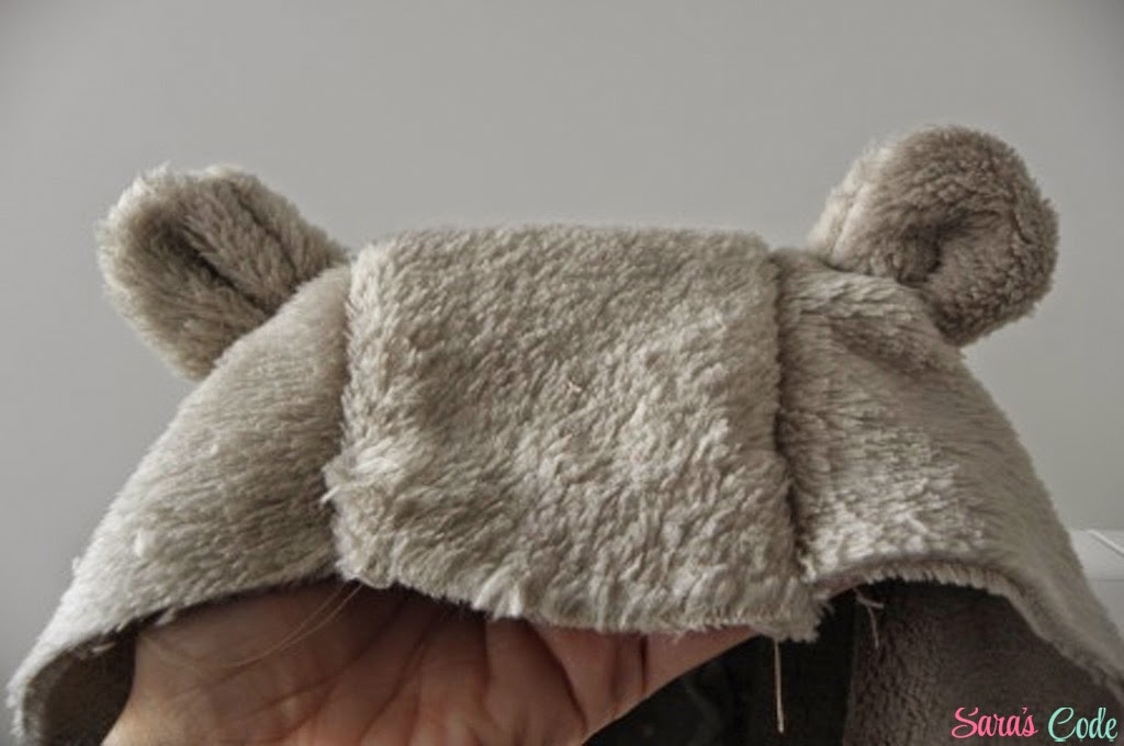? Cogemos las piezas de la capucha (dos laterales, las dos orejitas que acabamos de hacer y una pieza central) hacemos un corte en perpendicular de las piezas laterales de la capucha exterior y colocamos las orejas entre los cortes que hemos hecho y cosemos las orejas.